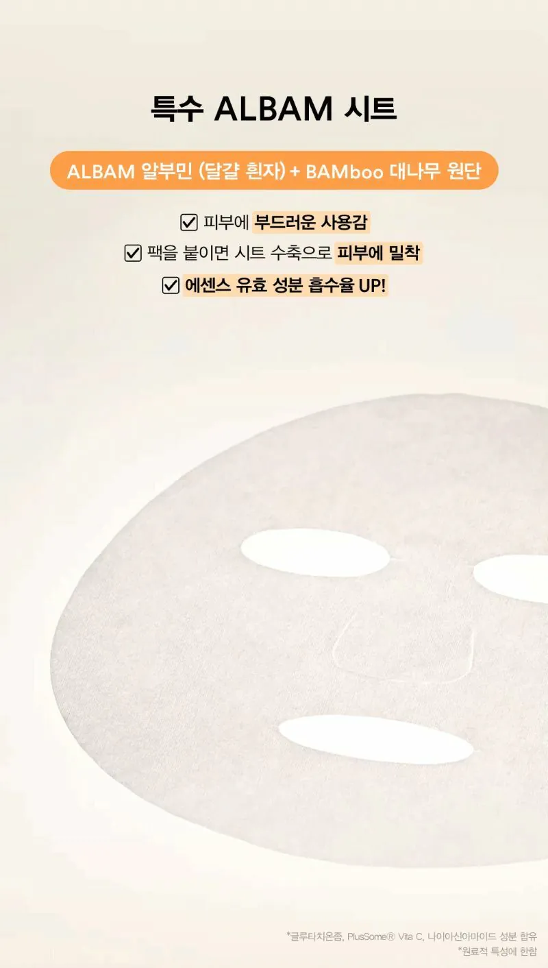 ✨面膜紙用 ALBAM (Albumin 雞蛋蛋白+ BAMboo 竹) 製成,柔軟親膚,超貼服易吸收