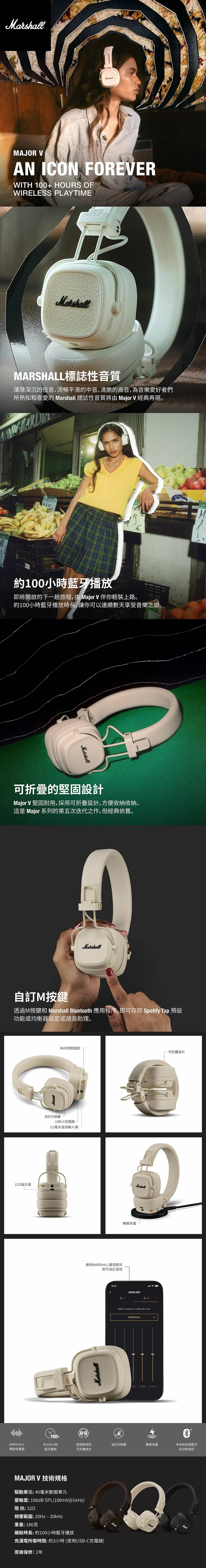 經典不會隨著時間消逝,只會歷久彌新,Major V也不例外。 從震撼的Marshall標誌性音質到雋永經典的外觀,這款耳機在每個細節上都經過精心設計。