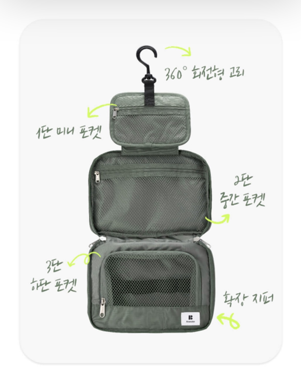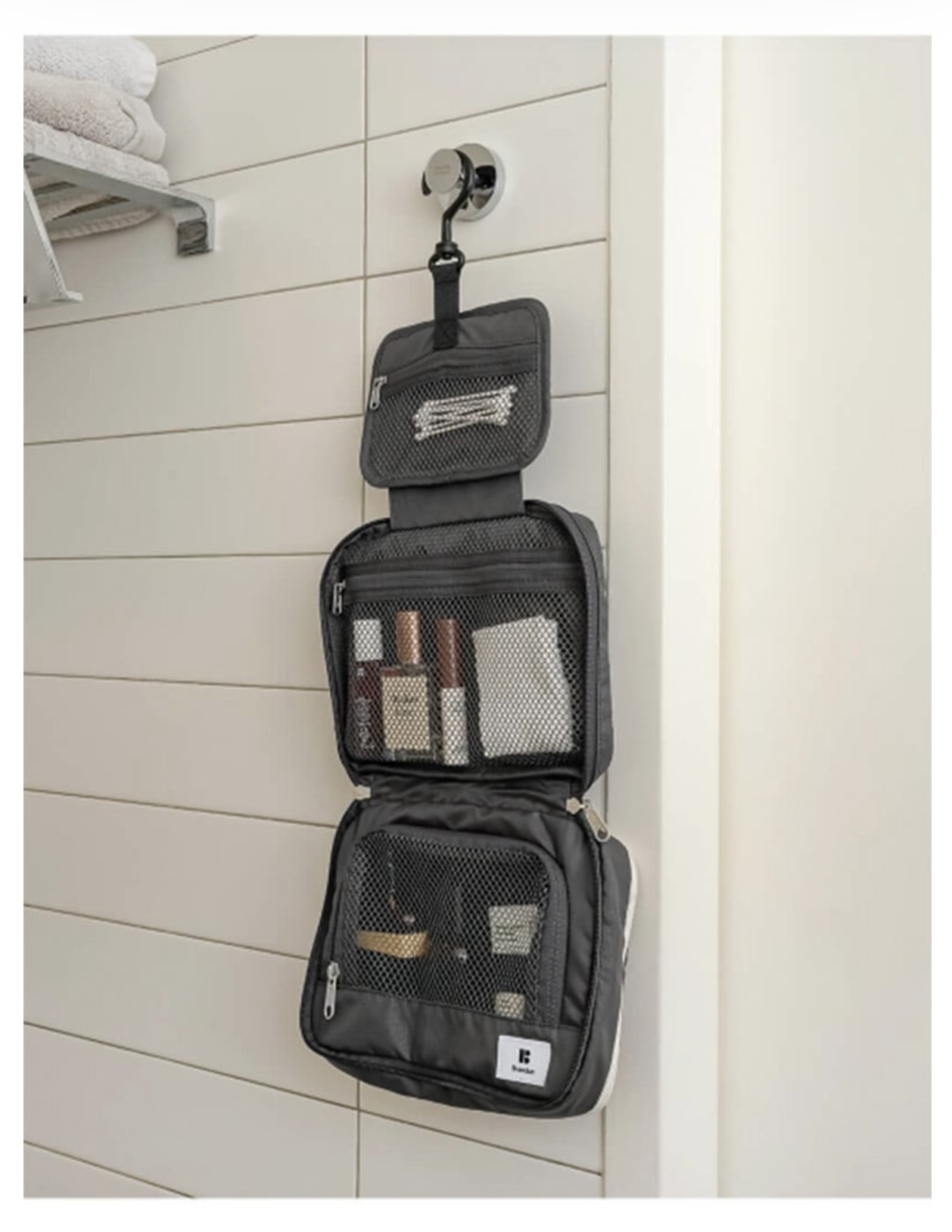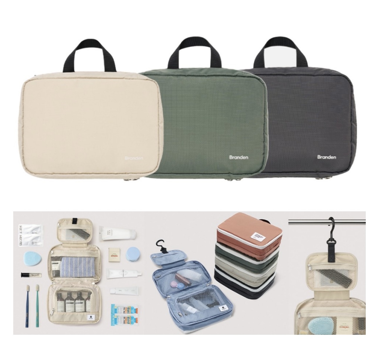 Branden 推出的旅行懸掛式洗漱袋(Branden Expandable Hanging Wash Bag)是一款專為旅行設計、可擴展容量的收納包,具有防水和三層折疊結構,方便整理各種洗漱用品。它提供米色、綠色和炭灰色三種顏色選擇。