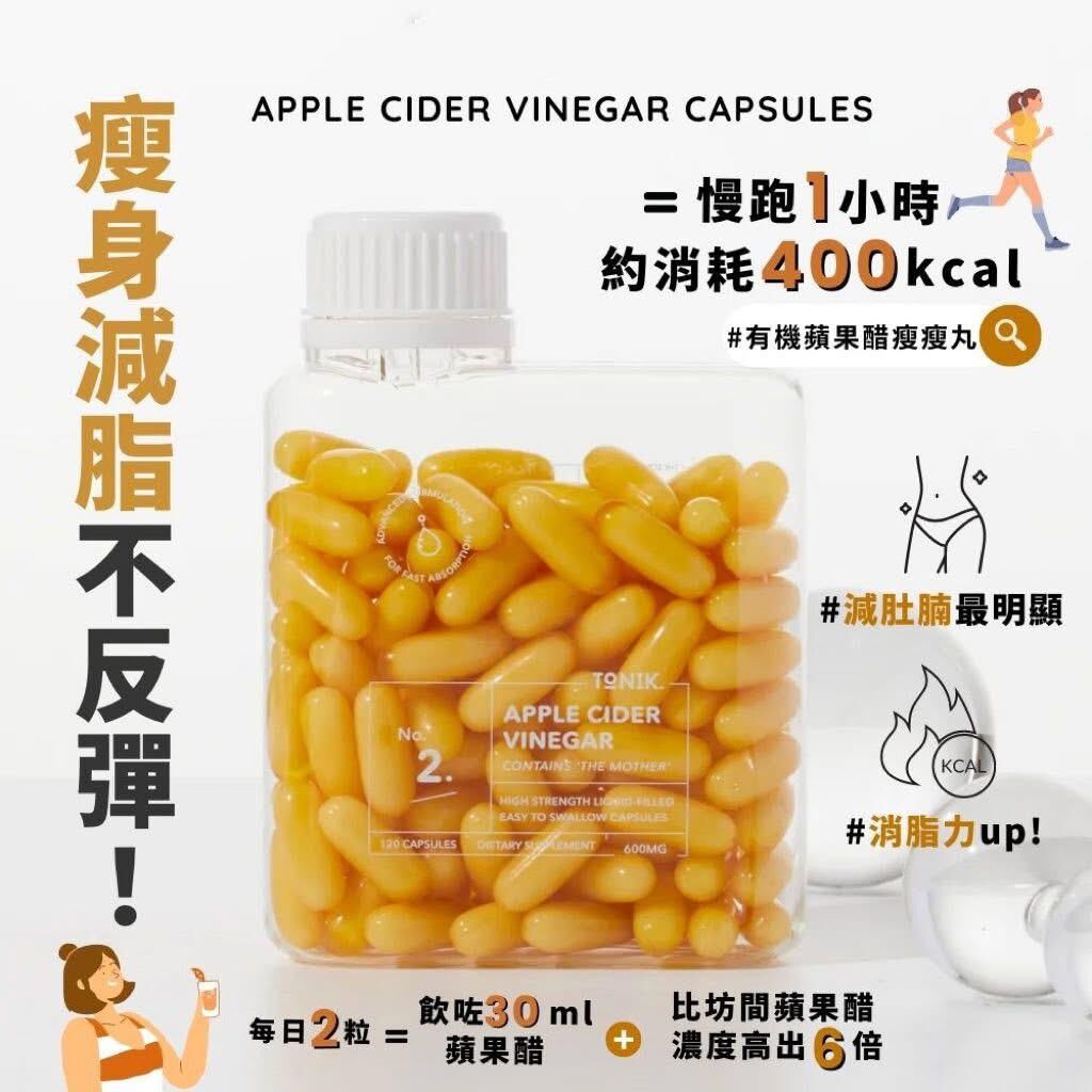 ToNIK有機蘋果醋纖脂丸 #快速燃脂🔥有機蘋果醋膠囊含有多種健康益處,可幫助解決幾乎所有問題:腸道健康、大腦功能、皮膚暗沉、腹脹等等世界上第一個也是唯一一個充滿液體的有機蘋果醋膠囊,易於服用且吸收速度更快的膠囊中提供 6 倍濃度的 ACV。但與液體形式不同,沒有可怕的味道、氣味或麻煩,無刺激,無異味,易於服用且方便攜帶【以濃縮膠囊的形式存在的液體蘋果醋】富含多種元素,維生素葉酸,煙酸,維生素C,還有大量礦物質天然蘋果醋,不含麩質、硫酸鹽等。無刺激,液體