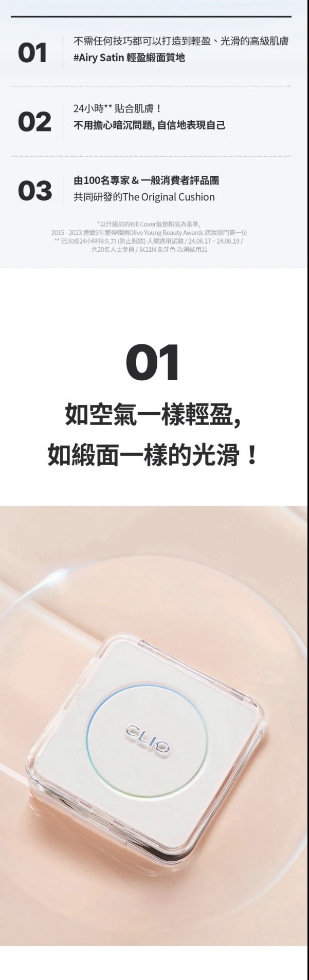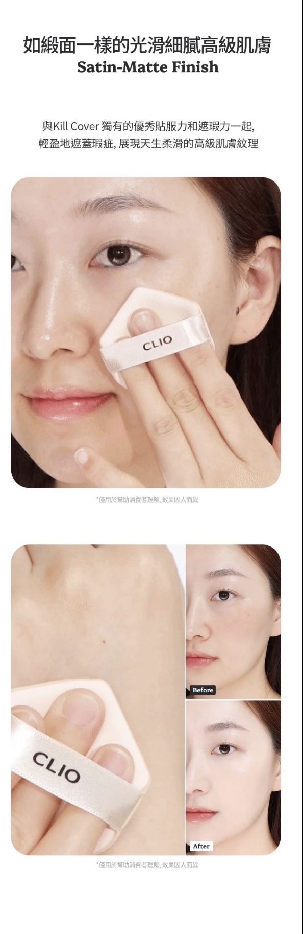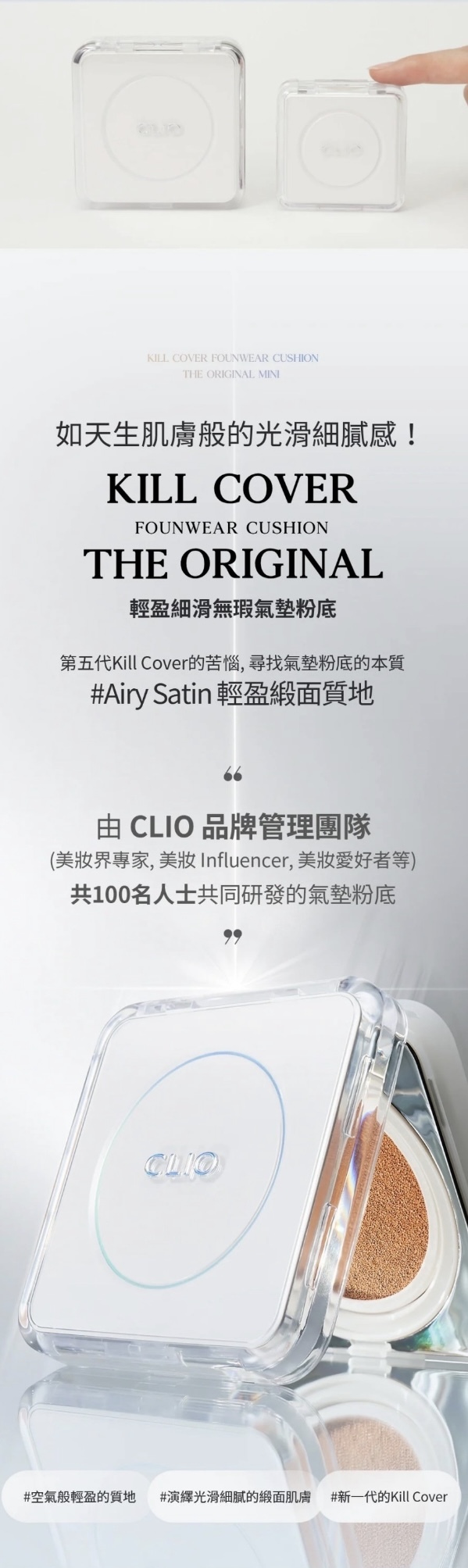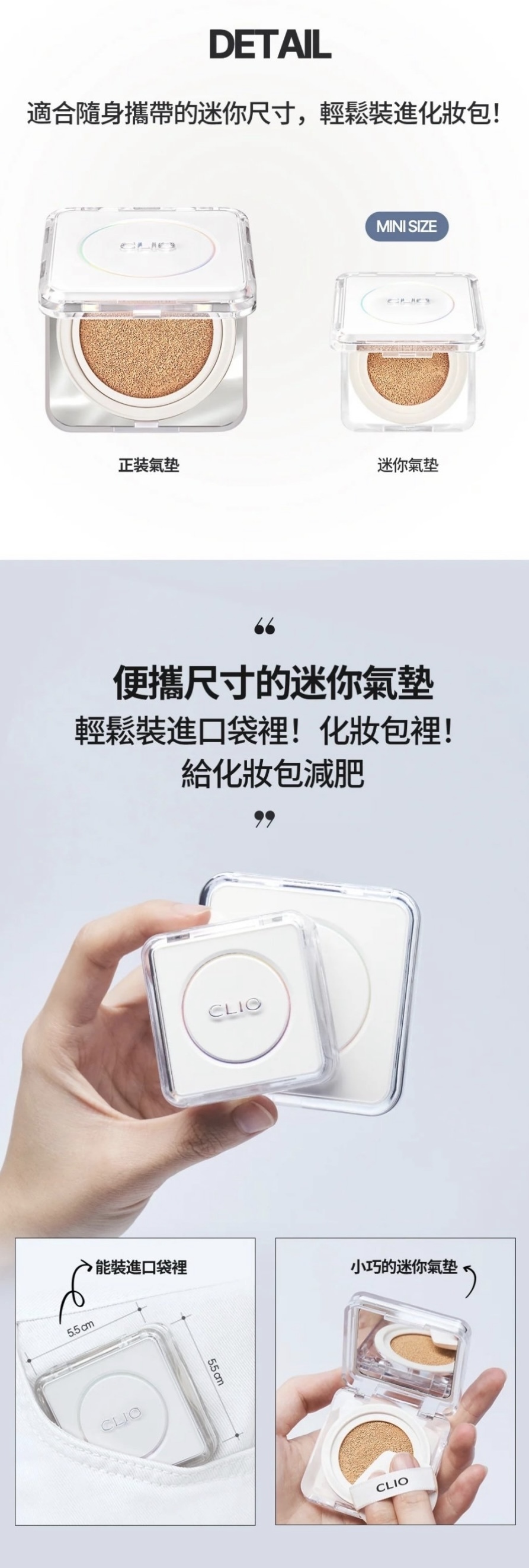 [CLIO] 迷你輕盈細滑無瑕氣墊粉底 THE ORIGINAL MINI 是一款方便攜帶的氣墊粉底,提供如空氣般輕盈的緞面妝感和高效遮瑕力,其自然的妝感和出色的遮瑕度,只需薄薄一層就能有很好的效果。長效持妝效果也受到好評,很適合忙碌的生活方式。