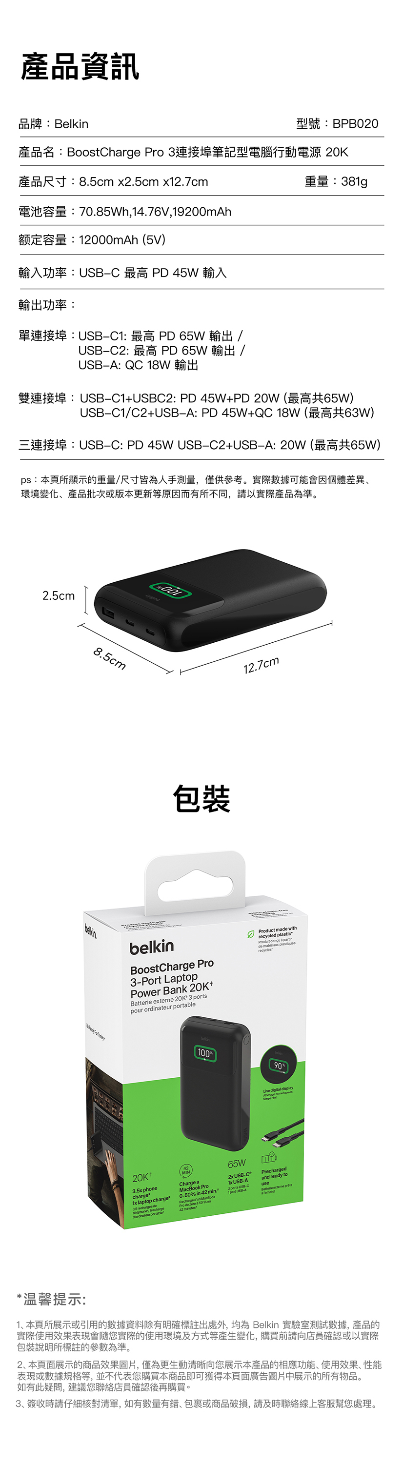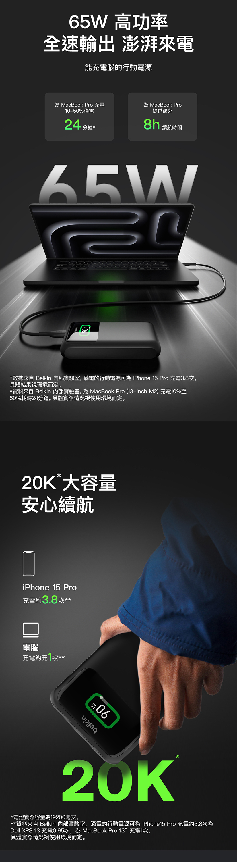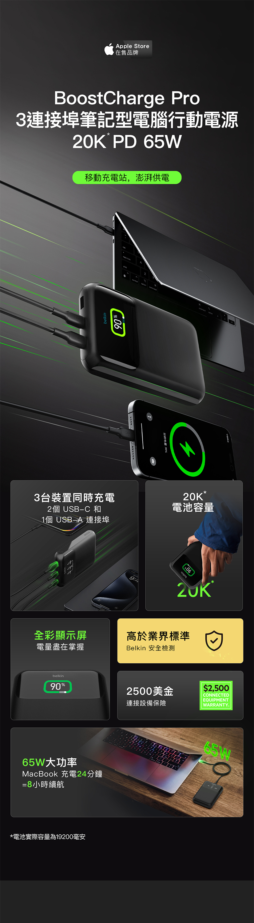 具備20K電池 的行動電源,能安全快速為您的筆電、MacBook和其他設備充電
