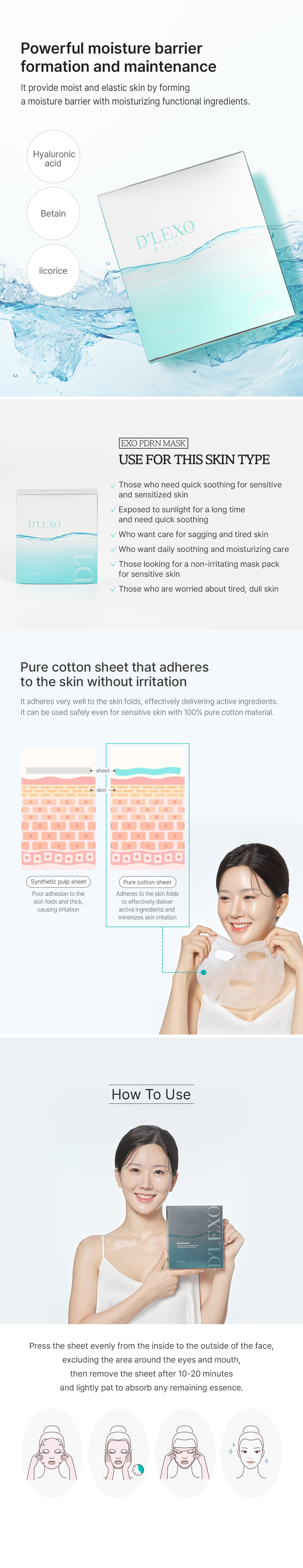 面膜含有 CICA-EXOSOME、PDRN、Aquatide、甜菜鹼、積雪草和透明質酸等營養成分,有助於恢復肌膚的自然能量