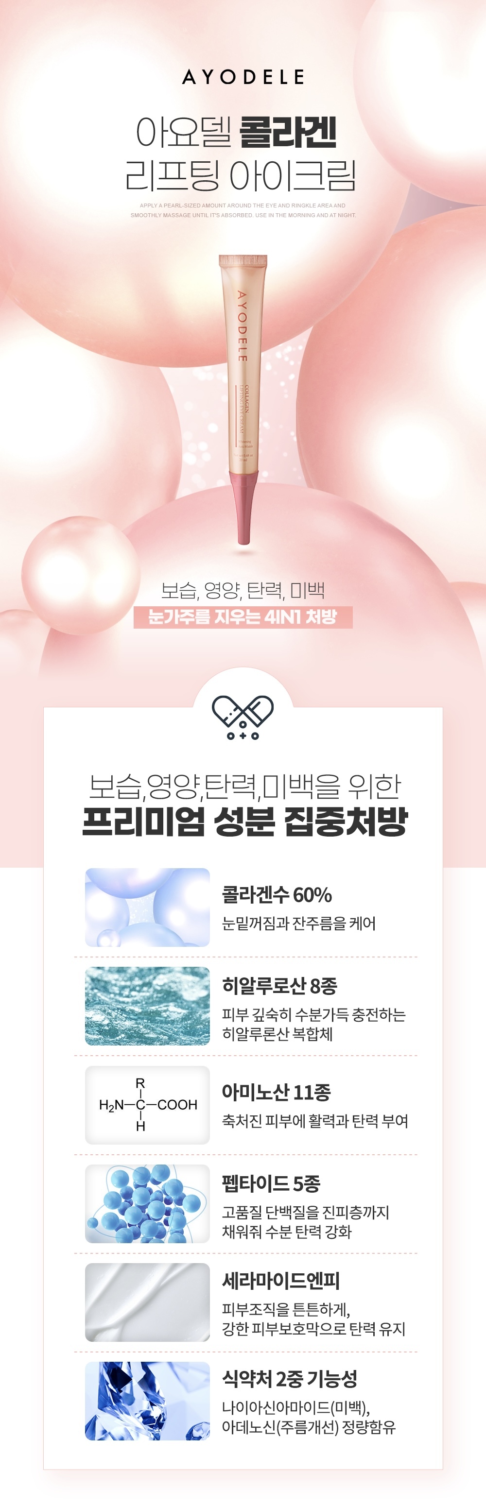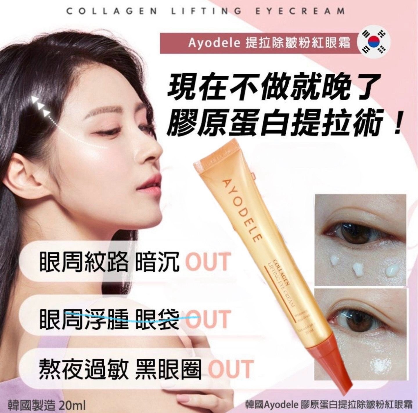 韓國 AYODELE 膠原蛋白緊緻眼霜 20ml 是一款針對眼周細紋、乾燥和暗沉問題設計的保養品,富含膠原蛋白及多種保濕成分,旨在提升肌膚彈性並深層滋潤。