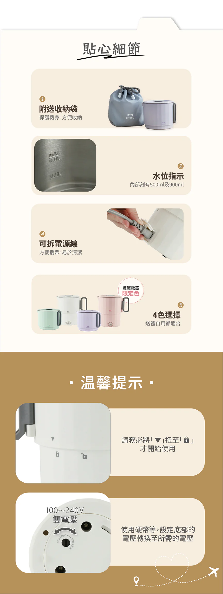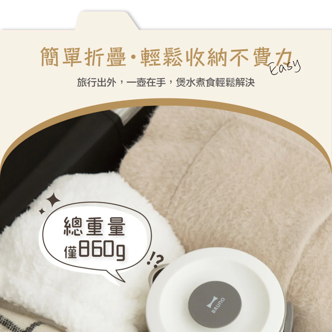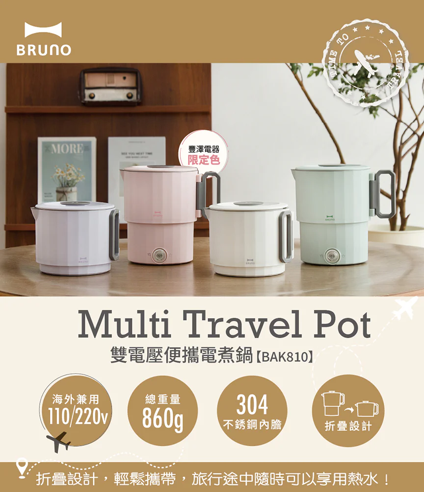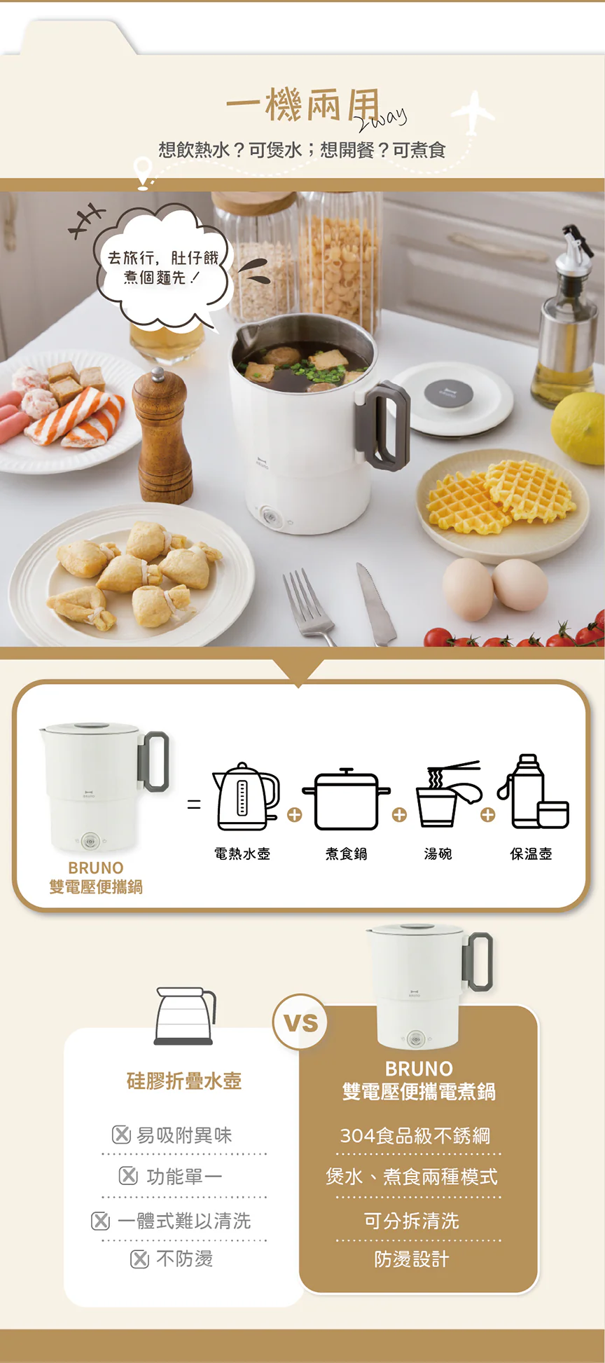 BRUNO 雙電壓便攜鍋是一款功能全面的旅行電煮鍋,配備雙電壓 (110V/220V),極致輕巧的折疊式收納設計,適合全球旅遊使用。內置304不銹鋼內膽,確保安全衛生的烹飪體驗。