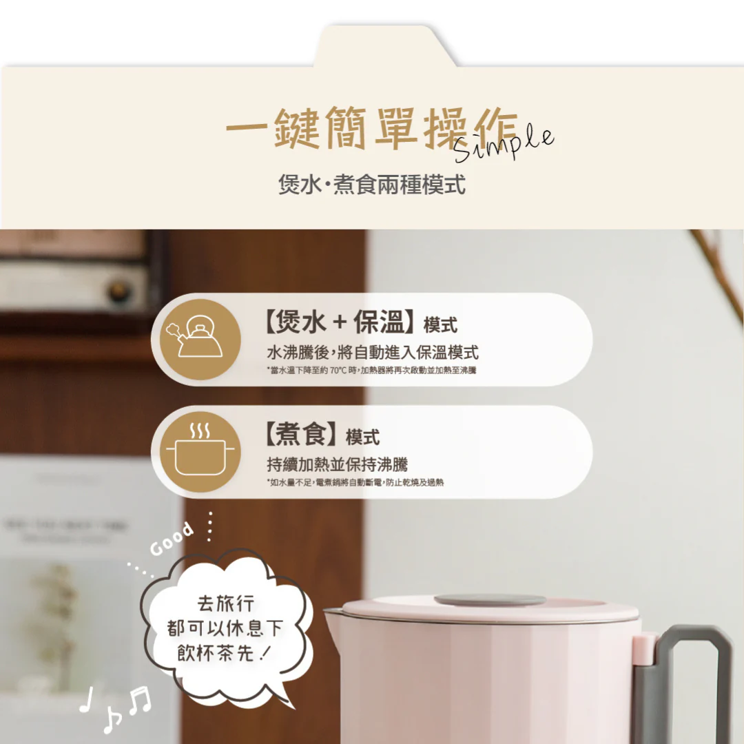 智能煲水及保溫:水沸時自動停止加熱,自動切換至保溫模式
