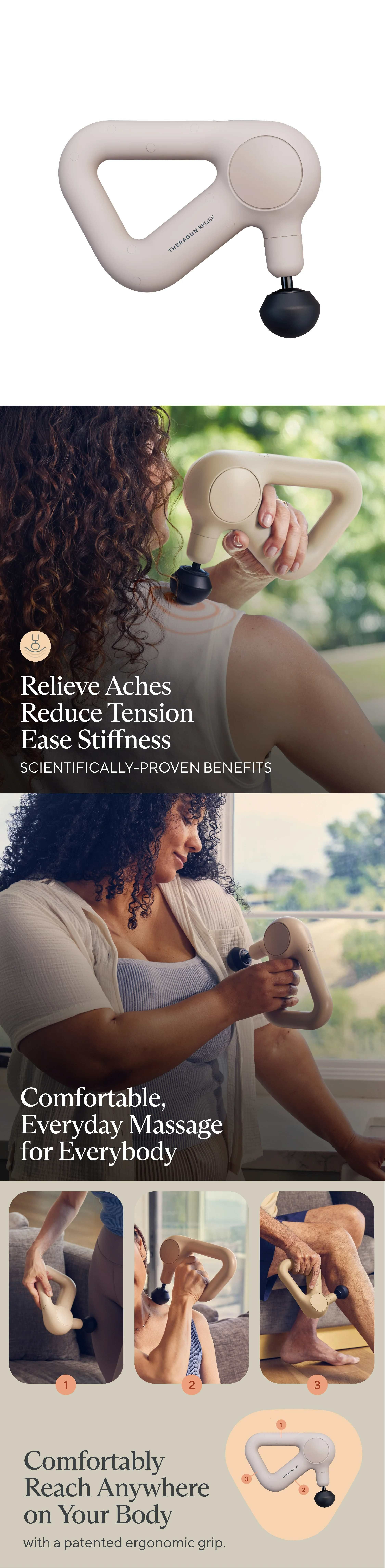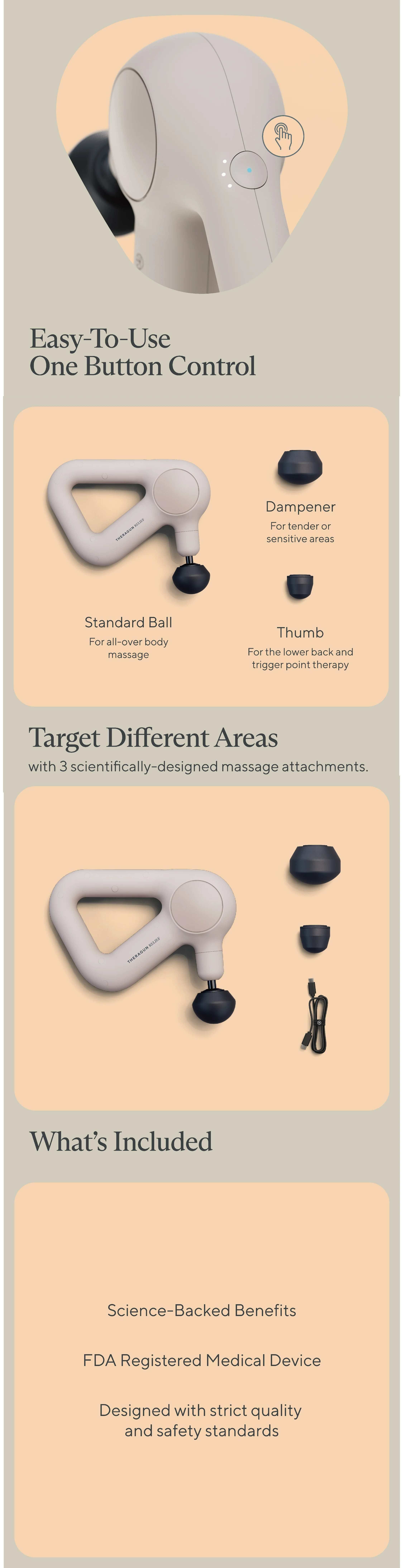採用符合人體工學的三角手柄設計,無論用家握著三角形上任何一條手柄,都能保持絕佳平衡,可以更舒適及靈活地按摩身體不同部位。按摩槍提供 10mm 振動幅度按摩功能,配合跟機的 3 種按摩槍頭,可為全身不同肌肉進行按摩,紓緩日常疼痛並改善睡眠質素。機身配備一個實體鍵,簡單易用。Theragun Relief 凈重 642g,方便隨身攜帶及在出國旅遊時使用。亦讓您比以往使用得更輕鬆、 感受更舒適。
